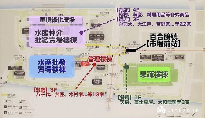 | 过程 | 浅草站 →(都营浅草线)→ 新桥站 →(百合海鸥线)→ 市场前站 →(步行3分钟)→ 丰洲市场 |