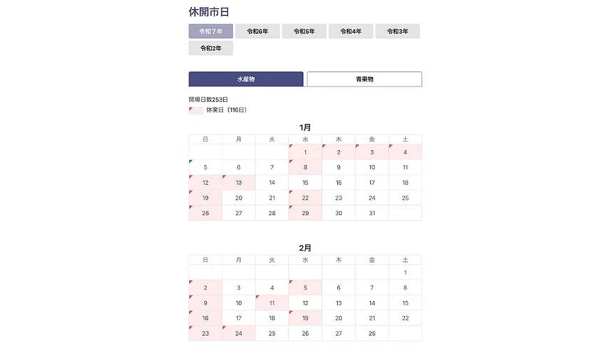 丰洲市场固定于日本国定假日休市,另有指定休市日,通常周日及部分周三休市。不像筑地市场即使在休市日仍有部分店铺营业,丰洲市场在休市日当天是全面停止开放,不仅无法入场参观,餐饮店也全数休息,若在当天前往真的会白跑一趟,建议出发前务必先查阅丰洲市场官方休开市日历,以免扑空喔!