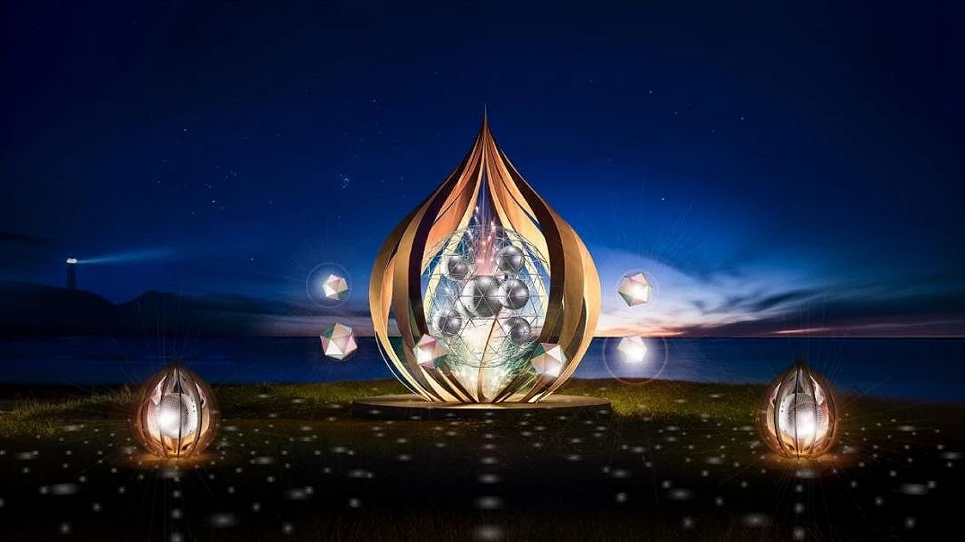 本届首次新增的鹄沼海滨公园区域,以「诞生之种子」为灵感打造巨型光影装置艺术。中央矗立着象征生命与希望的巨大种子造型,随着音乐节奏与色彩变化而闪烁,彷佛从地面萌芽出新的能量。周围的灯光波动像海浪般流动,让整座海滨公园化身为未来感十足的艺术舞台。