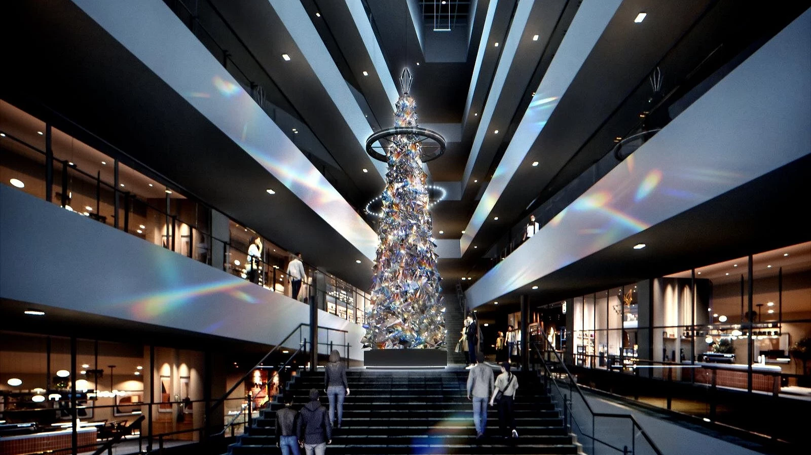 活动主角是一棵高约10公尺的巨大圣诞树,设置于表参道Hills本馆的中庭空间。树上悬挂约1,000件特制Prism Ray素材,当光线照射时,会反射出如彩虹般的多重色彩,让整个空间宛如被梦幻极光笼罩。白天时以纯白光呈现雪花般的清透氛围,而每隔约20分钟展开的特别演出中,圣诞树会随着音乐变化闪耀出彩虹光芒,光线如流动般穿梭,令人目不转睛。