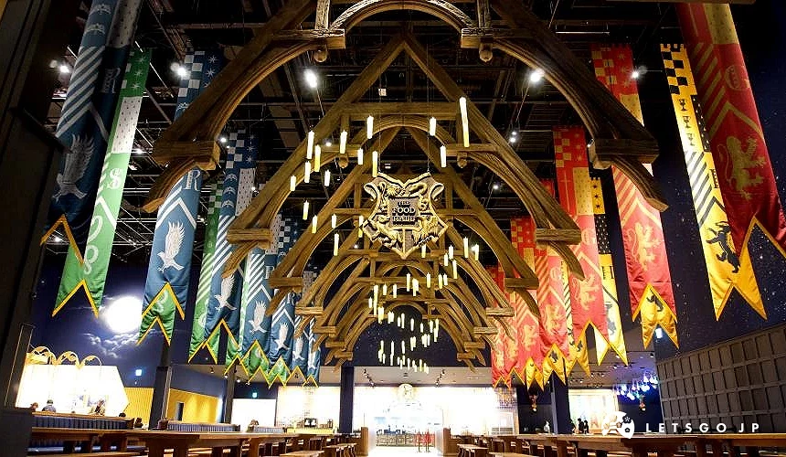 如果想认真吃饱的人,建议到「美食大厅」用正餐!这里重现了霍格华兹餐厅的模样,天花板高挂四大学院旗帜,让人彷佛置身魔法世界。菜单提供炸鱼薯条、烤牛肉、英式早餐等多样传统英式料理,吃饱喝足还能拍美照,魔法与美食一次满足!