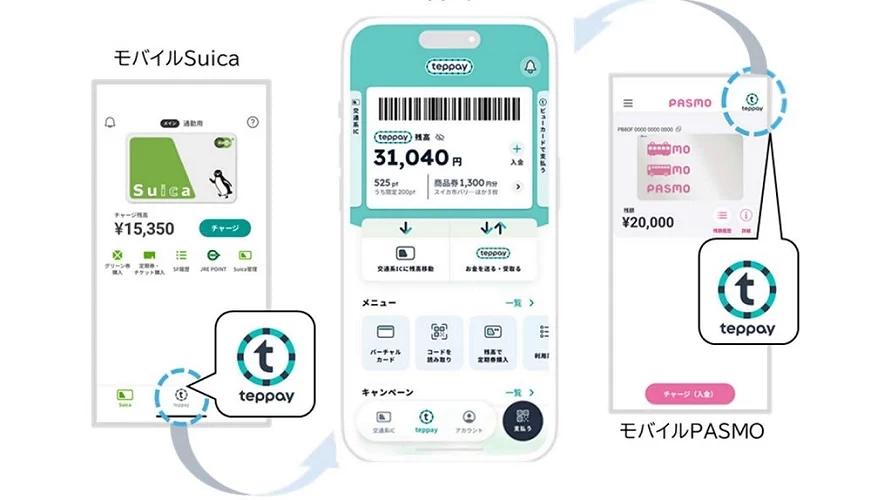 另一推行重点为「个人电子货币转帐功能」。随着 teppay 的上线,这项「转帐」能力也会同步升级为 App 内的「余额送付/受取」功能:使用者可在 teppay 用户之间互相转送余额,并可跨越行动 Suica 与行动 PASMO 的 App互通使用;但需注意交通系 IC 本身的余额无法直接互转,仅限 teppay 余额可送付/受取。此外,teppay 余额也能直接为行动 Suica 的交通系 IC 加值,或购买定期券等服务,进一步整合交通与生活支付。