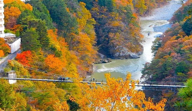 「鬼怒川温泉」是自江户时代以来就开汤的古老温泉地,温泉旅馆主要沿着鬼怒川两岸建造,被誉为「东京的奥座敷」,意指这里就像是东京的后花园一样,忙完了俗事,就可以来这里好好放空一下。除了来泡汤放松,也推荐前往横跨溪谷之上的「鬼怒楯岩大吊桥」或搭乘鬼怒川游船,欣赏鬼怒川溪谷的鬼斧神工。尤其秋季时火红枫叶与袅袅白烟交织出的景色,有如置身于梦境一般,美到让人舍不得眨眼。