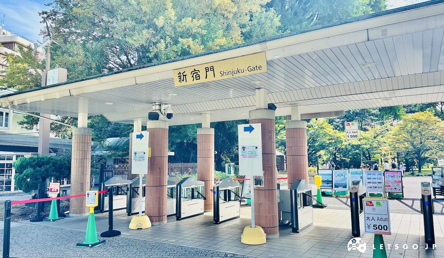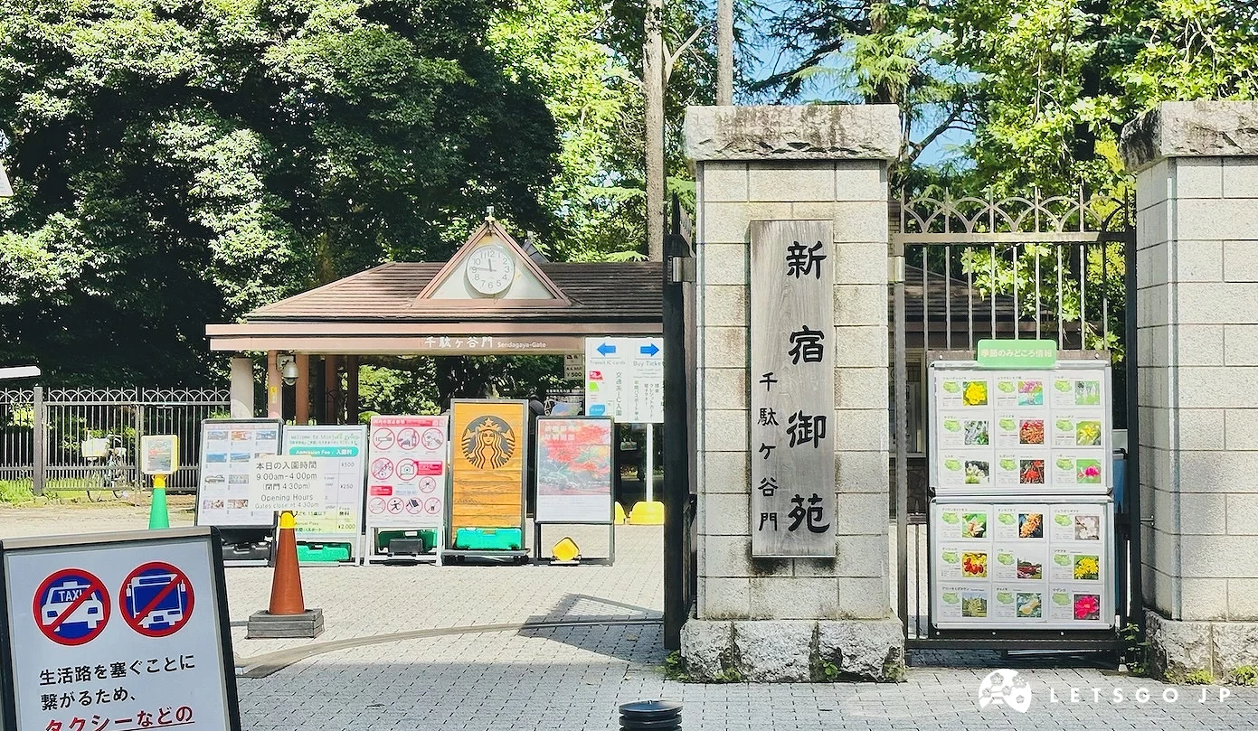 新宿御苑前站1号出口最近,从 JR 新宿站南口徒步约10分钟也能抵达,是人气最高、使用人数最多的主要入口。设施完善,售票处、洗手间和商店都集中在附近。