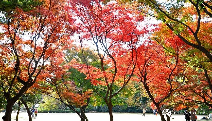 新宿御苑的枫叶最佳观赏期为11月中旬到12月上旬,银杏则从11月中旬开始转黄,最美的时期是11月下旬,红枫与金黄银杏同时盛开,营造出绝美秋景,到了12月上旬落叶时,园内更形成一片金黄地毯,美景令人难忘。