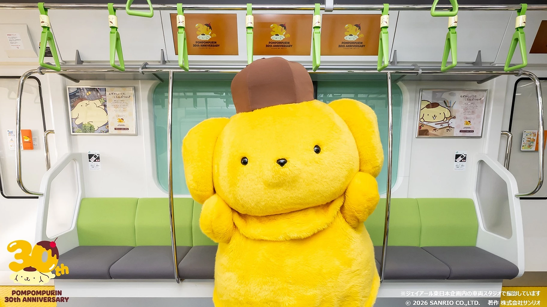为了庆祝布丁狗30周年,这列在JR山手线行驶的彩绘电车以30周年专属插画设计打造,整列电车不只在车身外观换上可爱的布丁狗图案,车内装饰也同步全面更新,从车内海报到车厢玻璃贴纸等细节,都能看到布丁狗与伙伴们的身影。