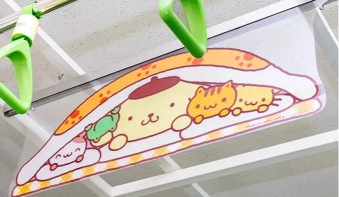 这次打造的彩绘列车,不只是外部缤纷吸睛,内装设计同样相当用心。车厢里的吊环与海报以布丁狗与伙伴们的生活场景为主题,整体色调柔和,营造出轻松又安心的氛围,让人一踏进车厢就彷佛走进布丁狗的世界。此外,电车内更同步播放特别制作的约4分钟动画内容,描绘布丁狗悠闲自在的日常模样,传递慢步调的生活感受,让原本匆忙的通勤时间,也多了一段能稍微放空的片刻。